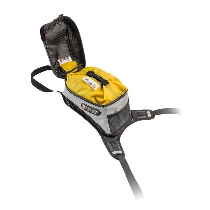 Fuel fills are a breeze with the Diablo: unzip the tank bag from the harness for quick and easy fuel access. Add to that, electronics pass-throughs integrated throughout each compartment, a full-length interior lining with hook-and-loop-accepting fabric compatible with many camera bag dividers, and included waterproof Giant Loop Tank Bag Dry Pod; the result is a bulletproof adventure-ready tank bag.